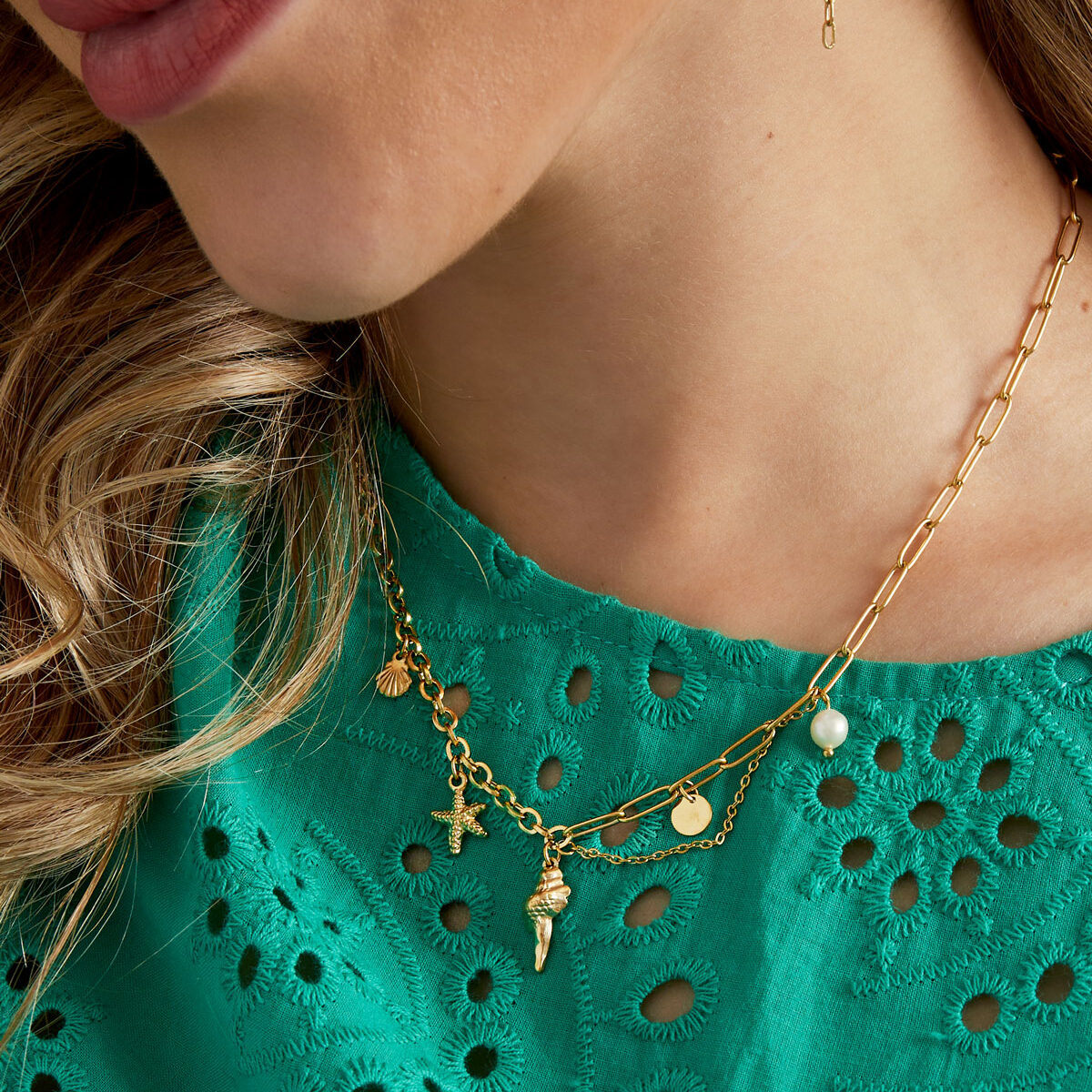 Ukrašena privjescima morske zvijezde, morske školjke i morskog puža, ova ogrlica će vas podsjetiti na šum valova i miris soli u zraku.